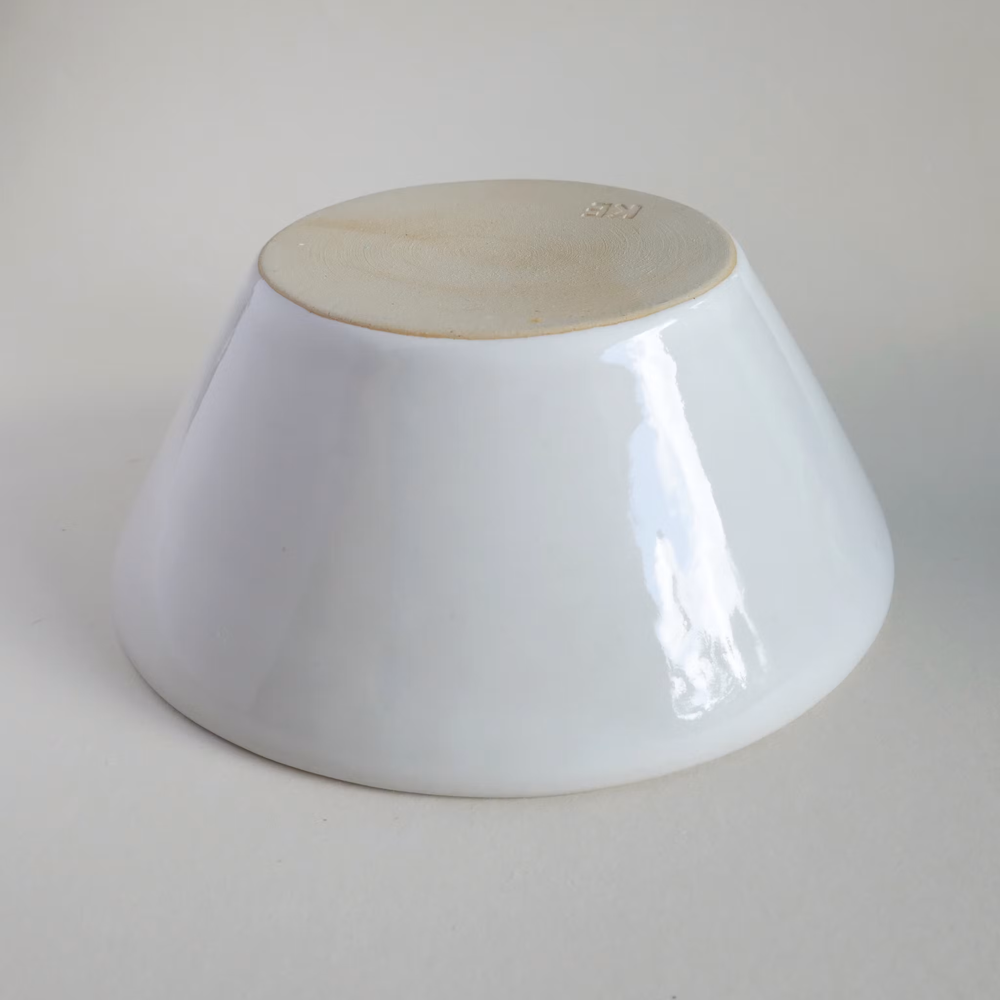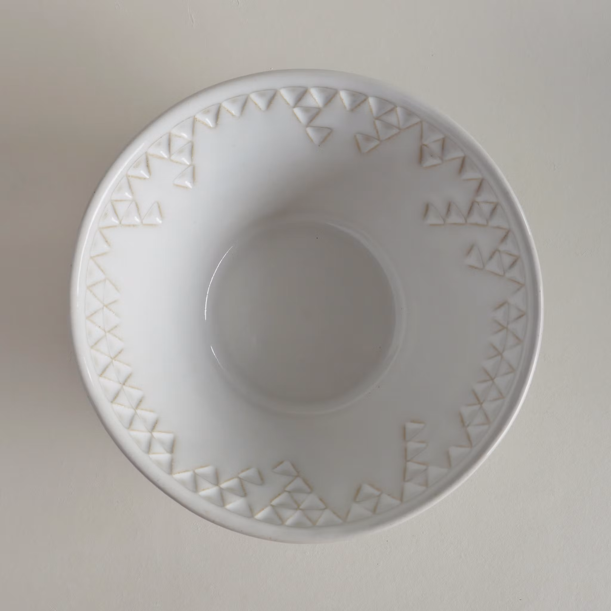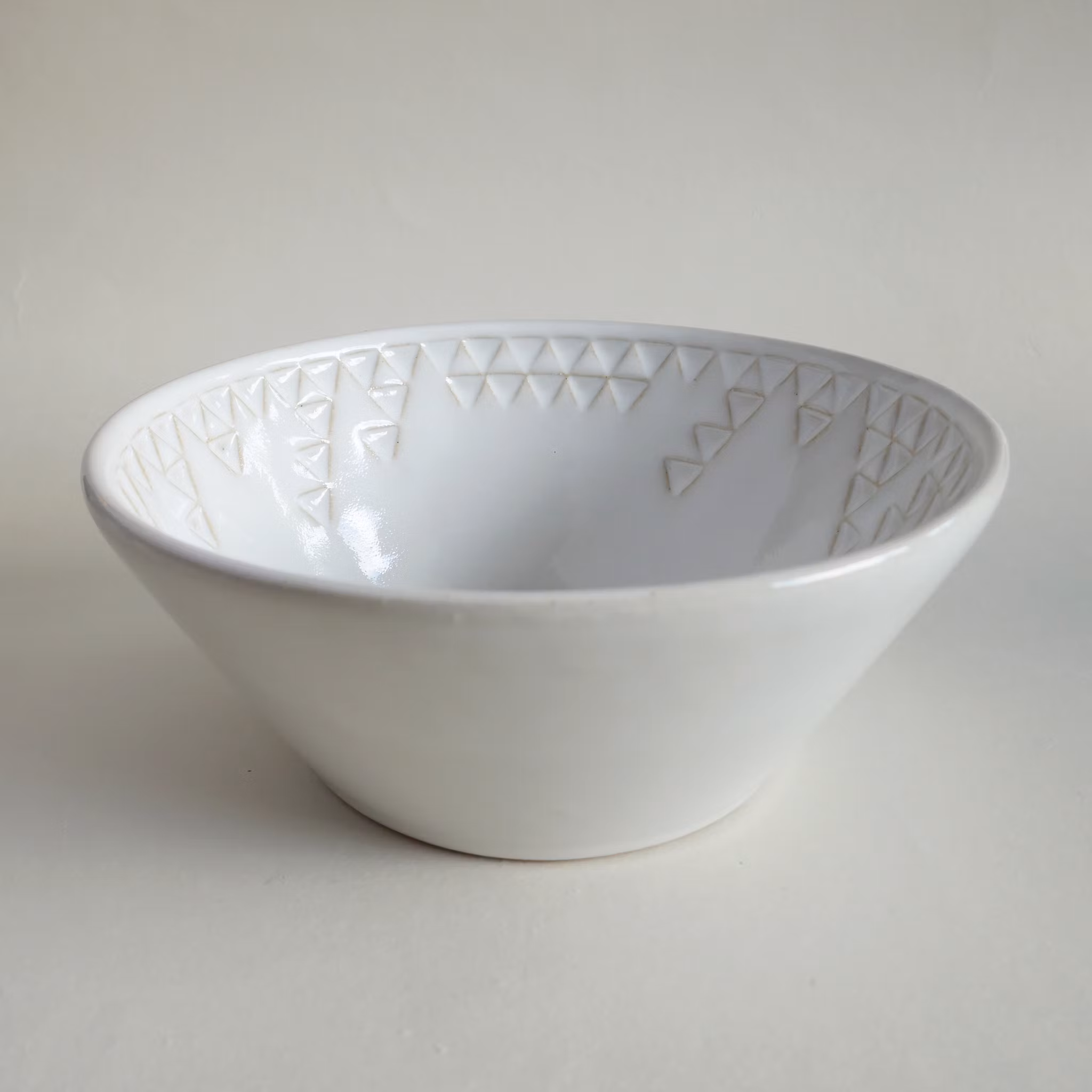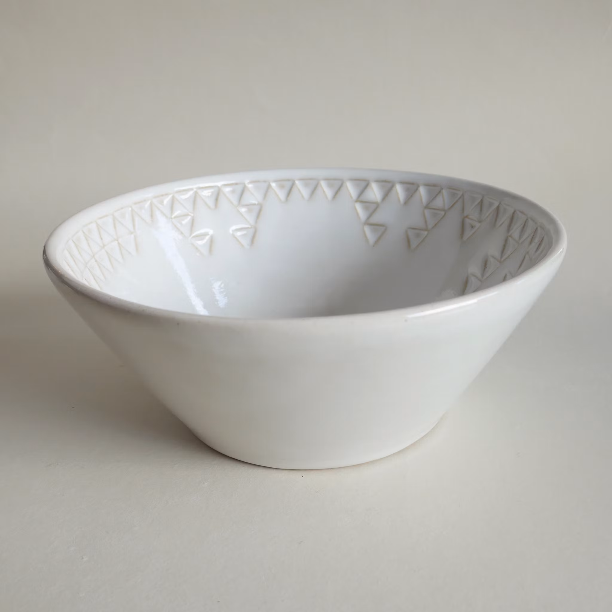 Skål med unik stämpeldekor. Gjord i ljus stengodslera med vit glasyr. Diameter ca 16 cm, höjd ca 6,5 cm.
