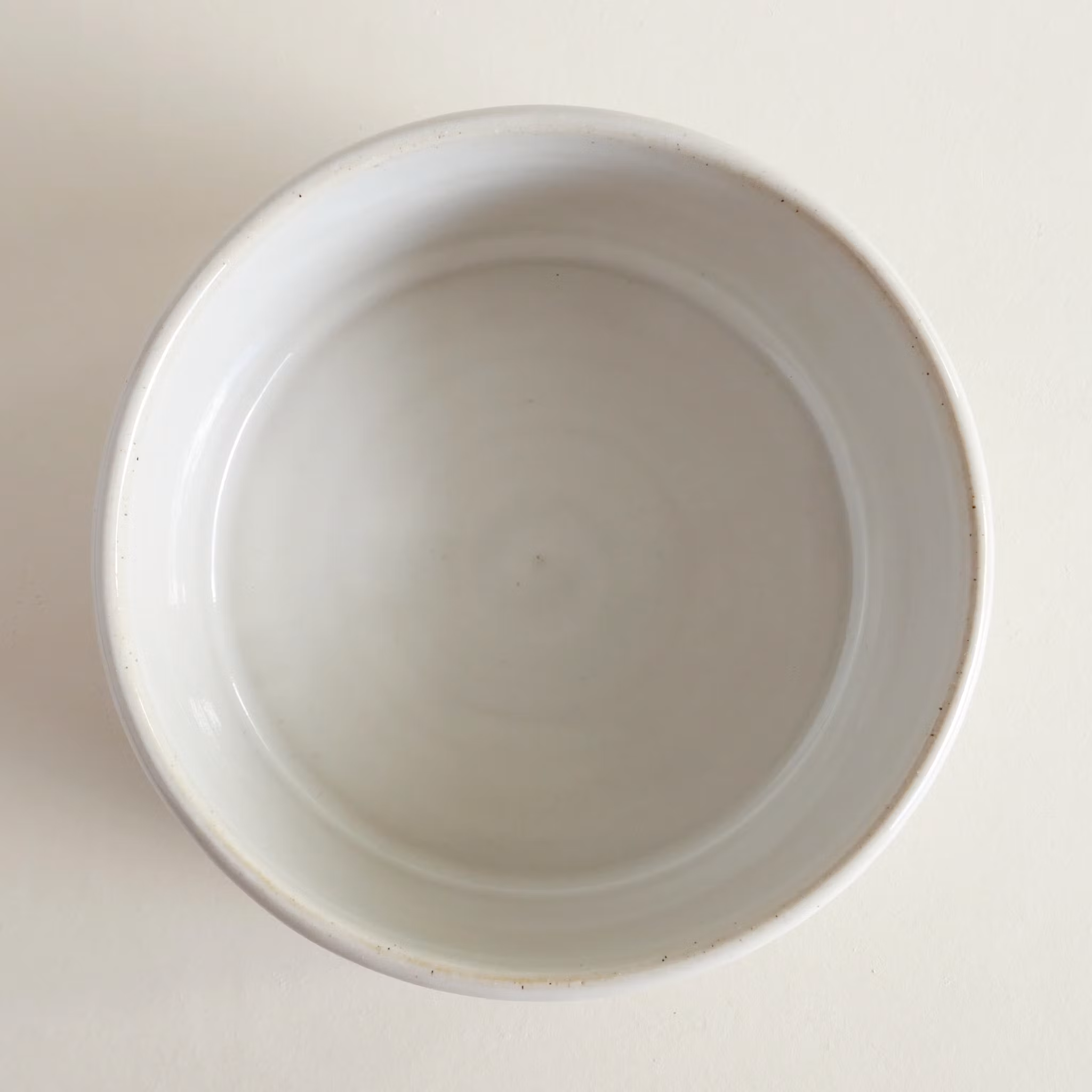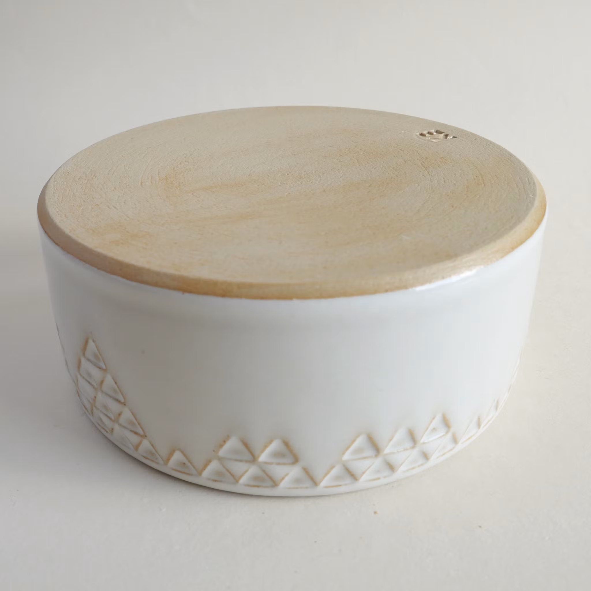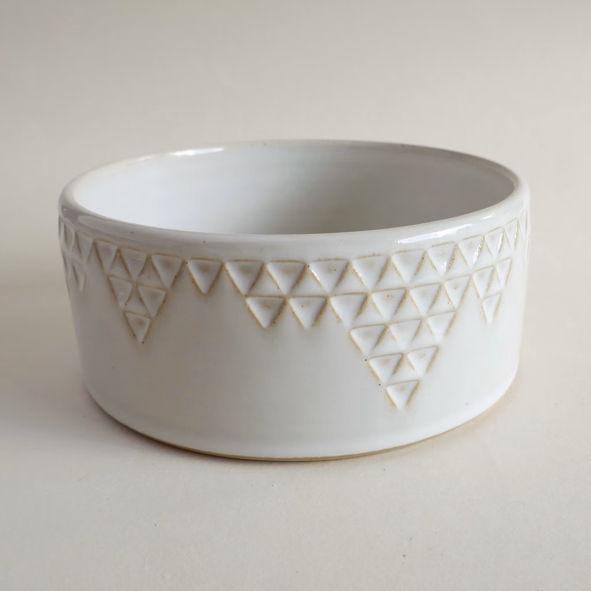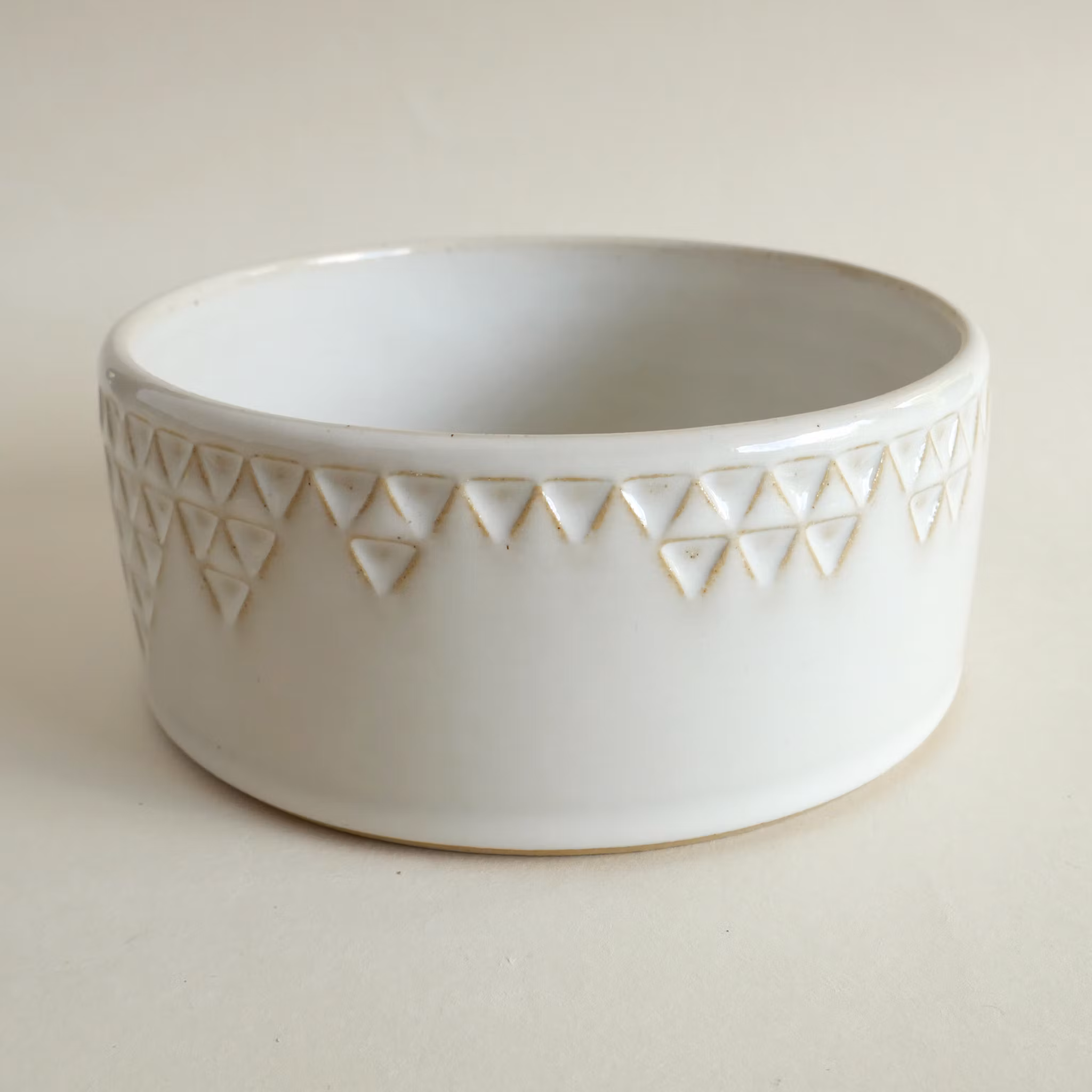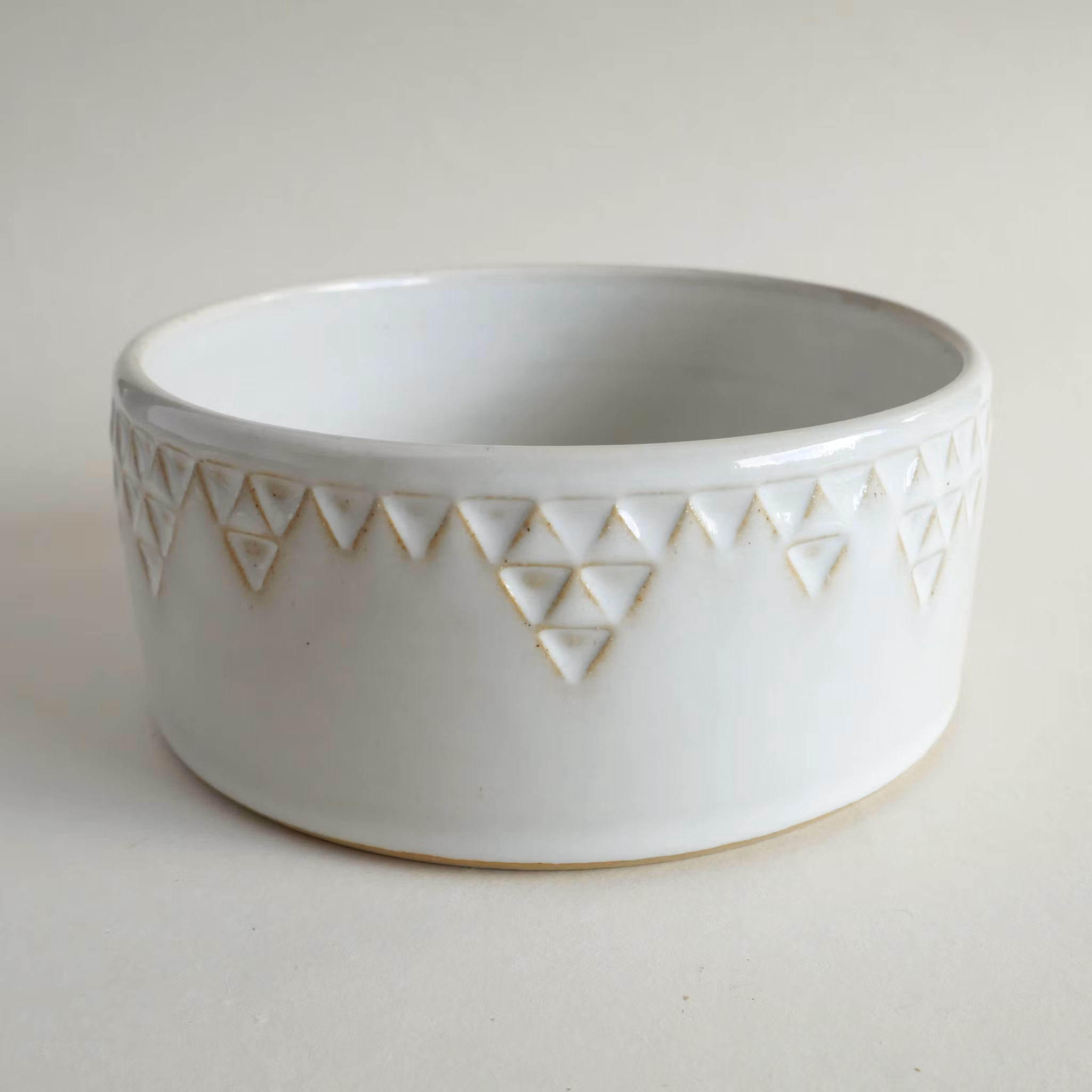 Drejad skål med unik stämpeldekor. Gjord i ljus stengodslera med vit glasyr. Diameter ca 15 cm, höjd ca 6,5 cm.