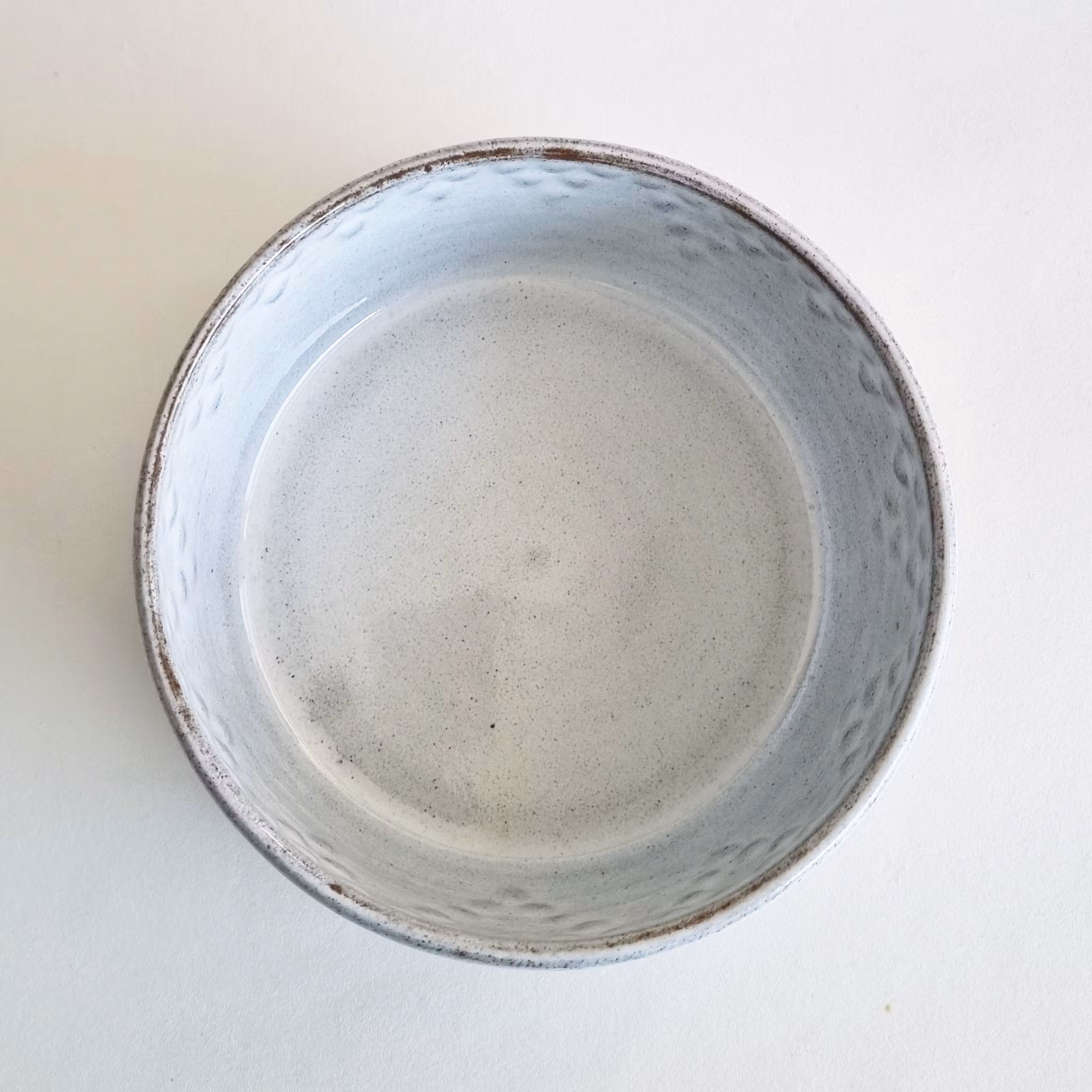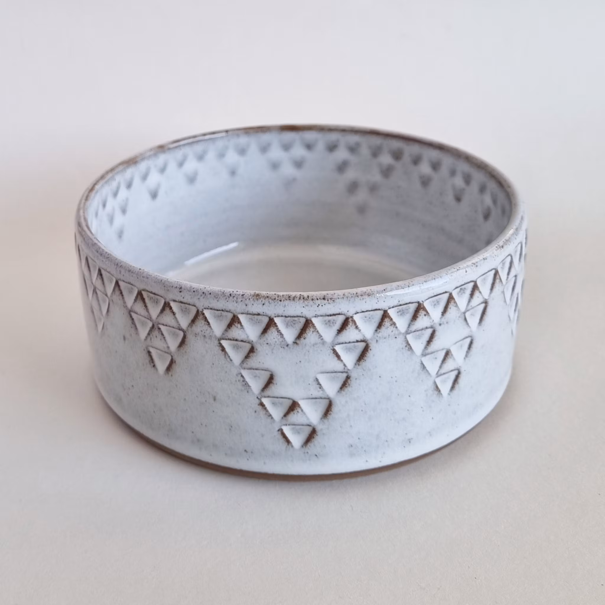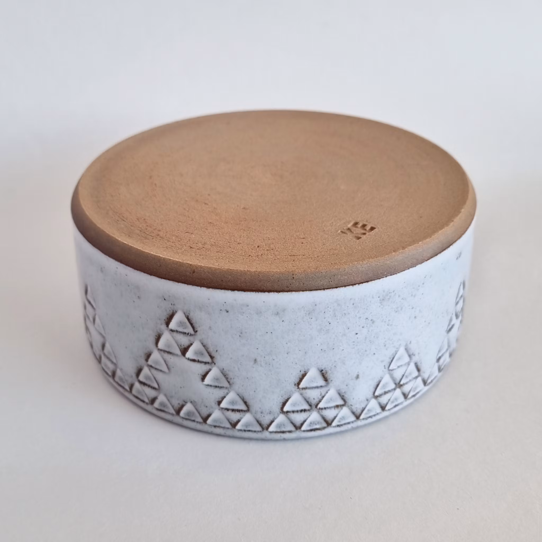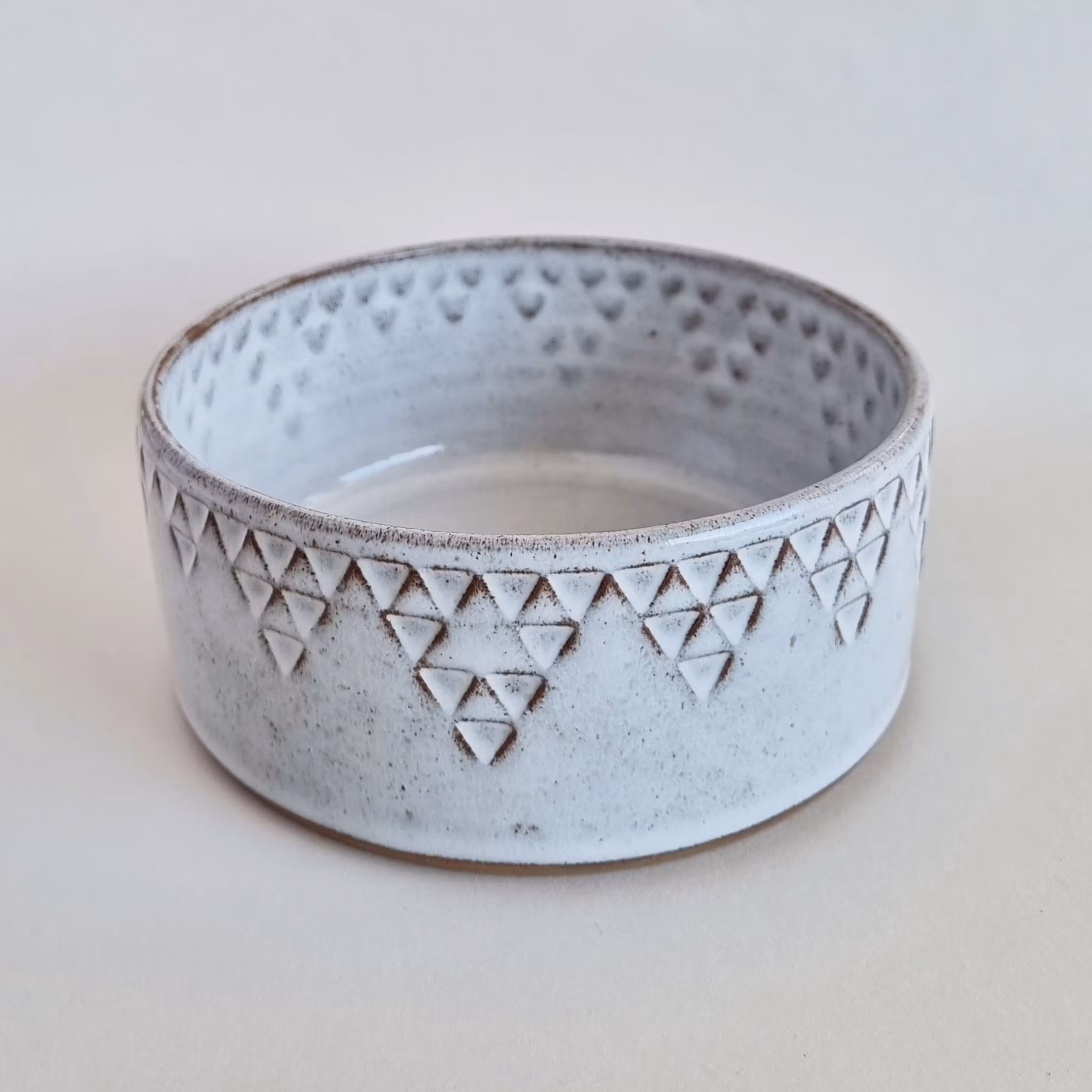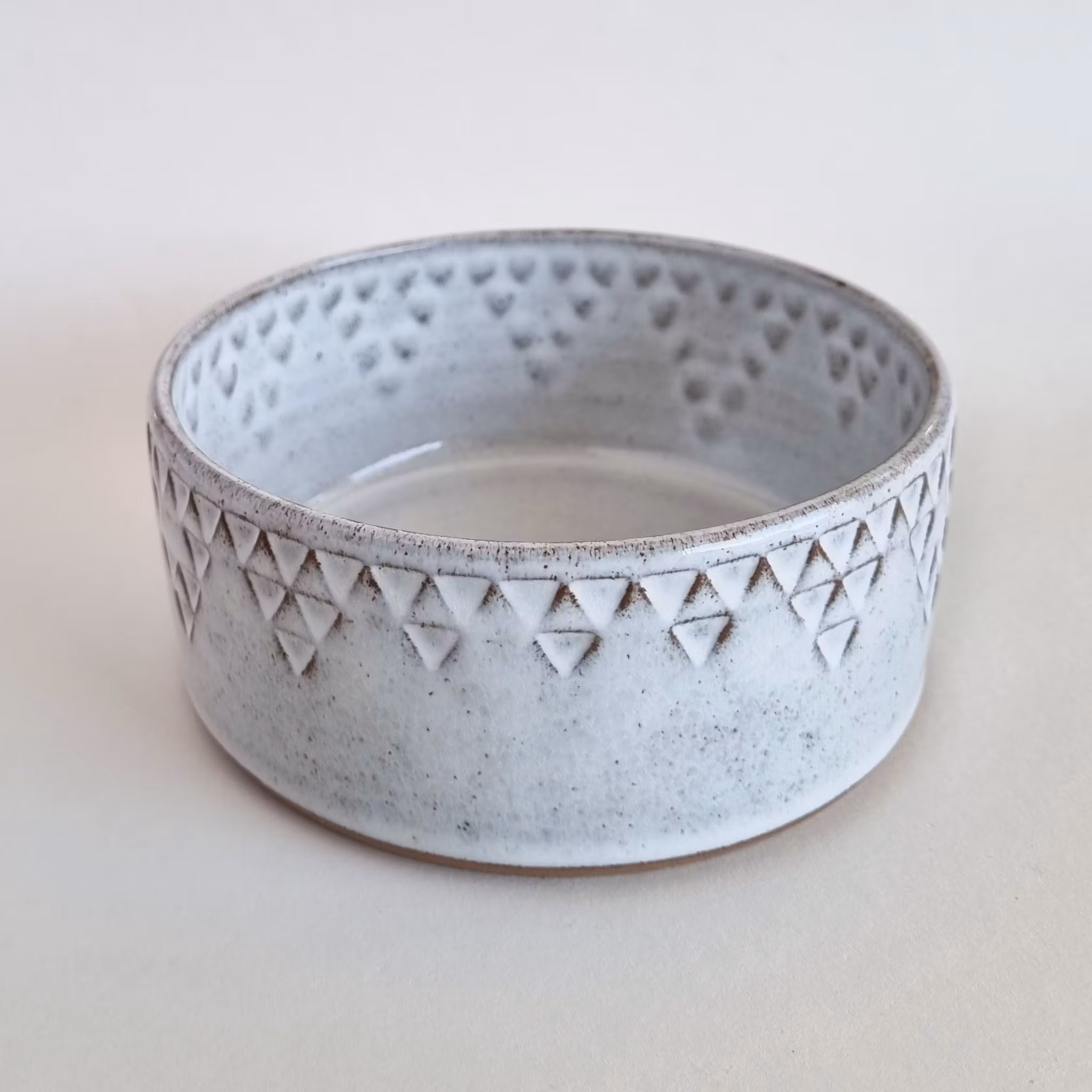 Drejad skål med unik stämpeldekor. Gjord i mörk stengodslera med vit glasyr. Diameter ca 15 cm, höjd ca 6,5 cm.