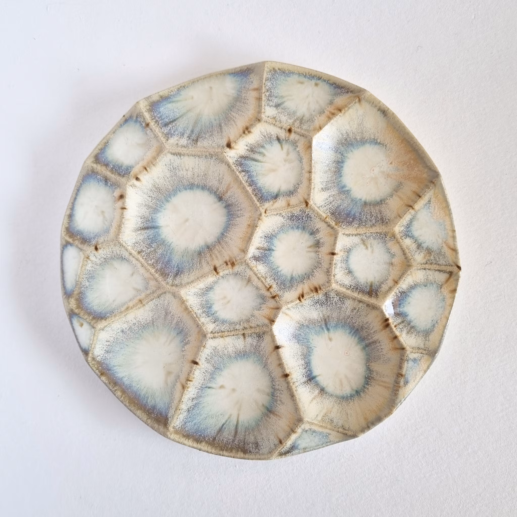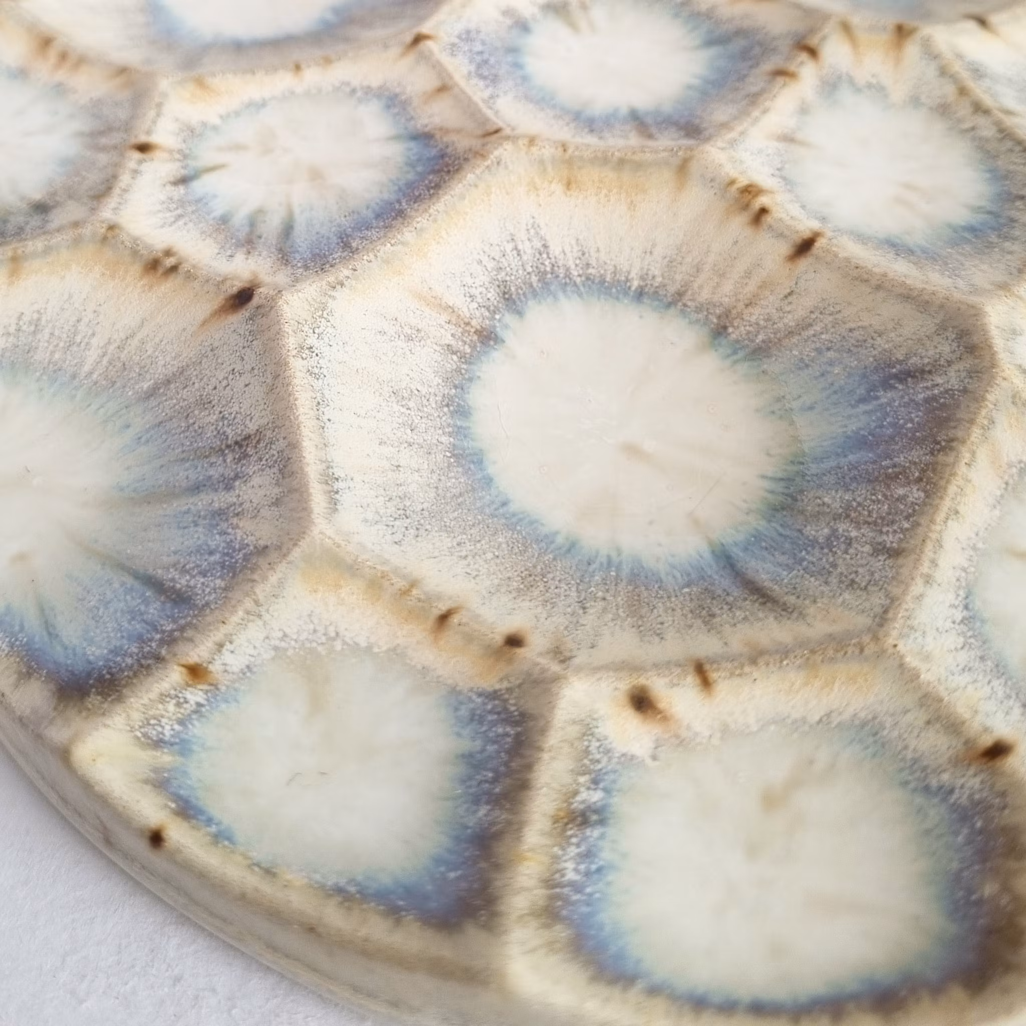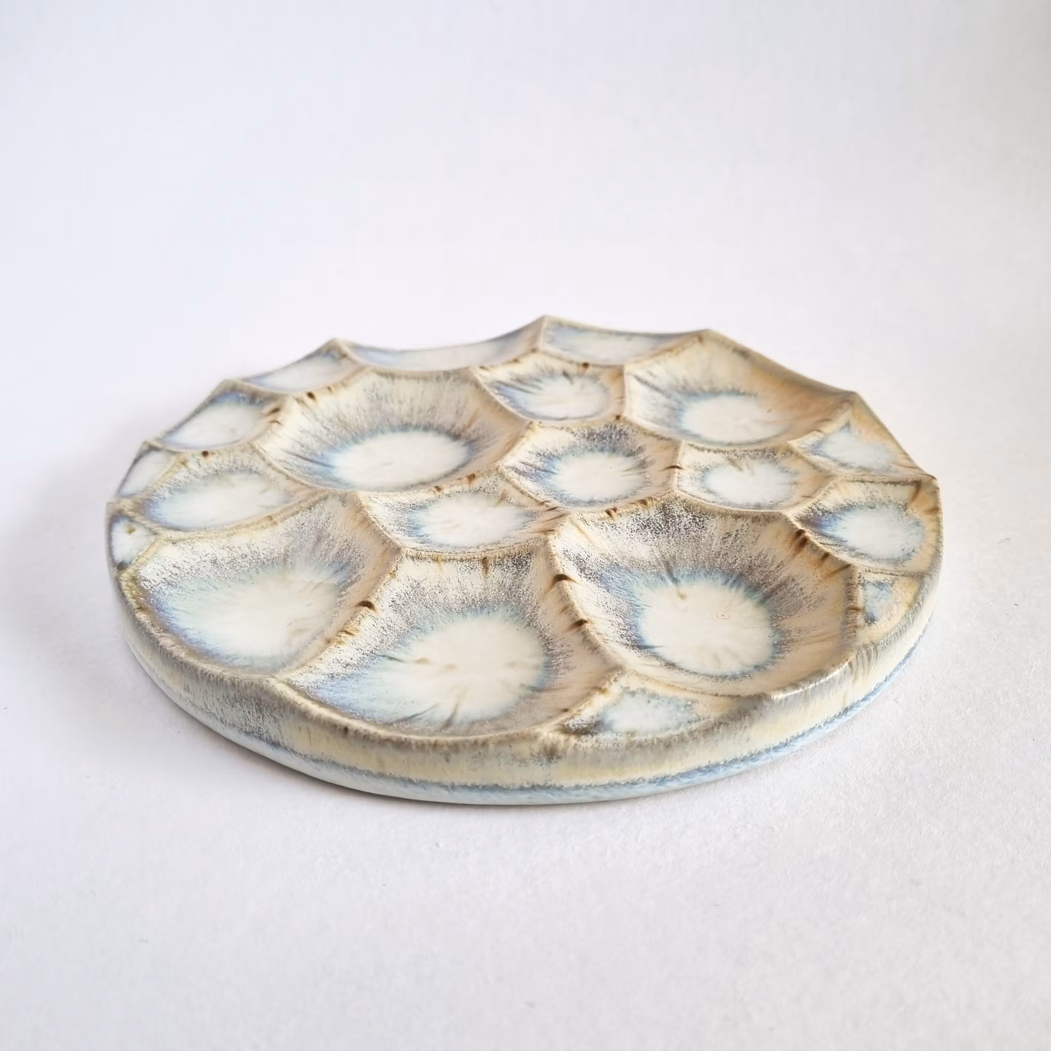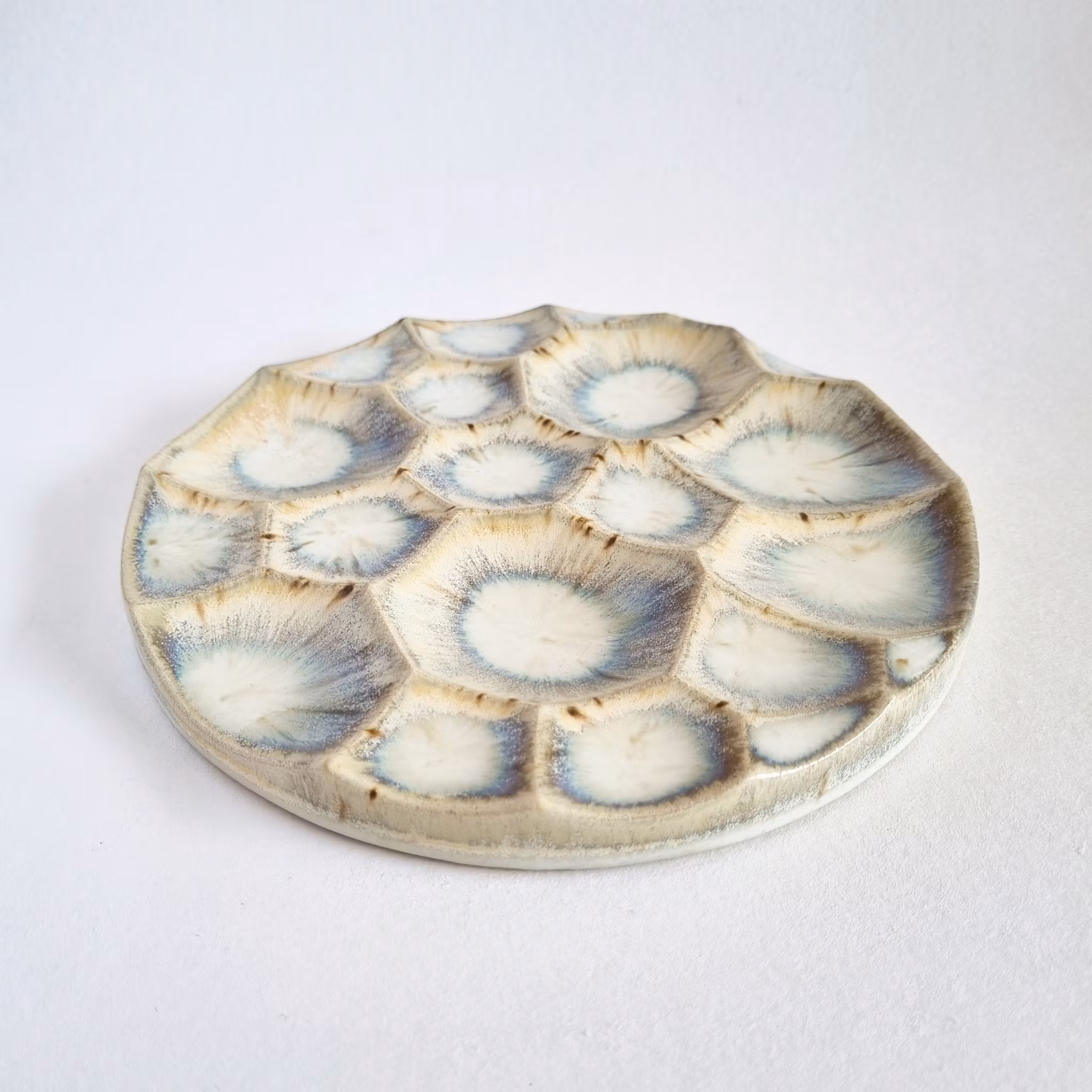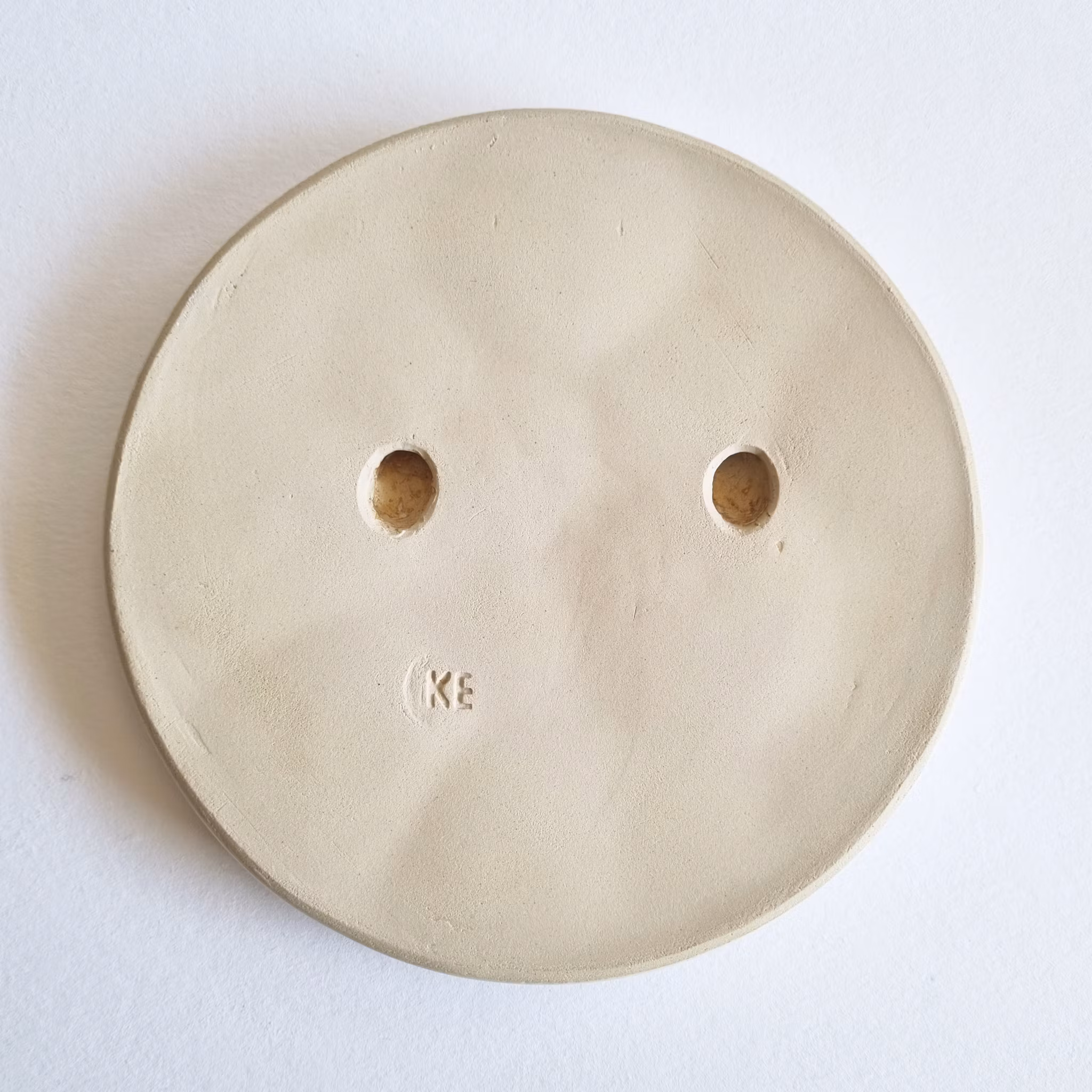 Form för trädgården för insekter att dricka vatten ur. Går också att hänga som väggskulptur. Diameter ca 17,5 cm, höjd ca 2 cm. Handgjord i stengodslera.