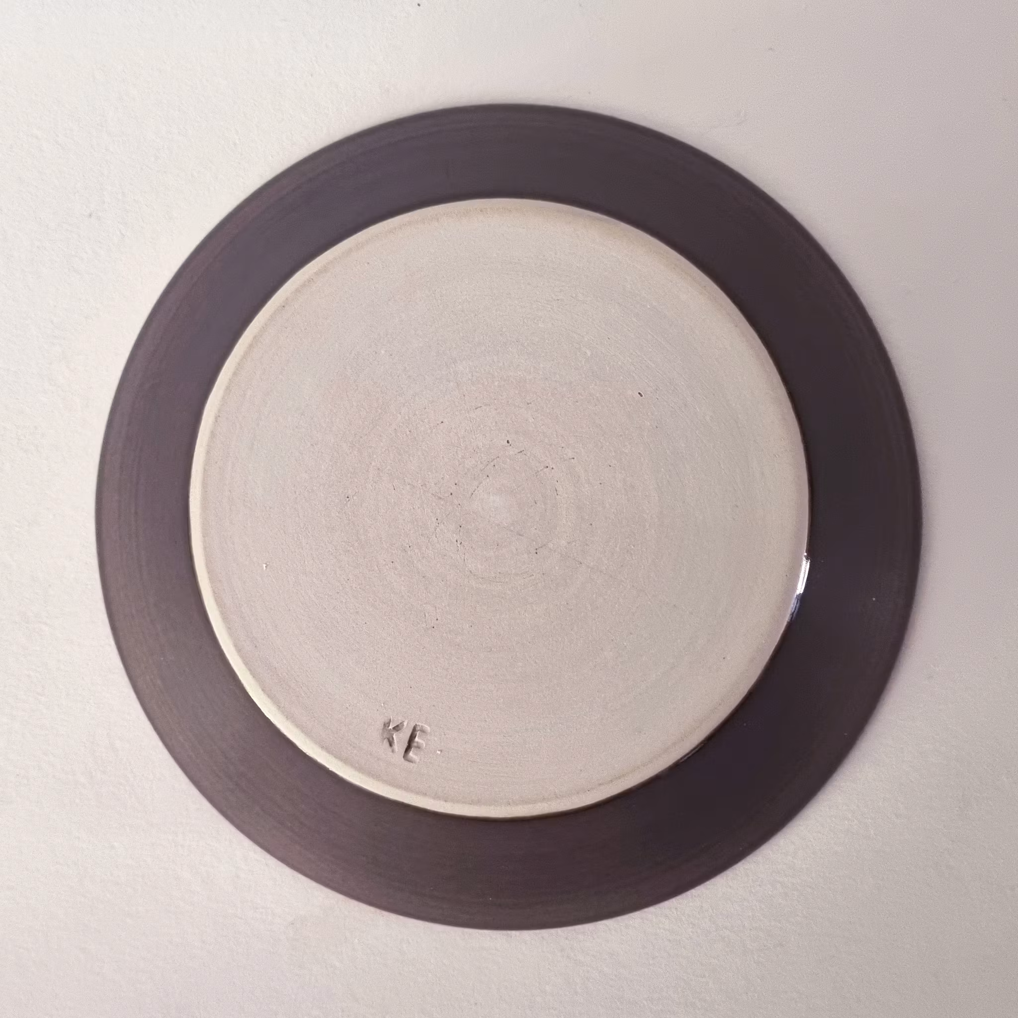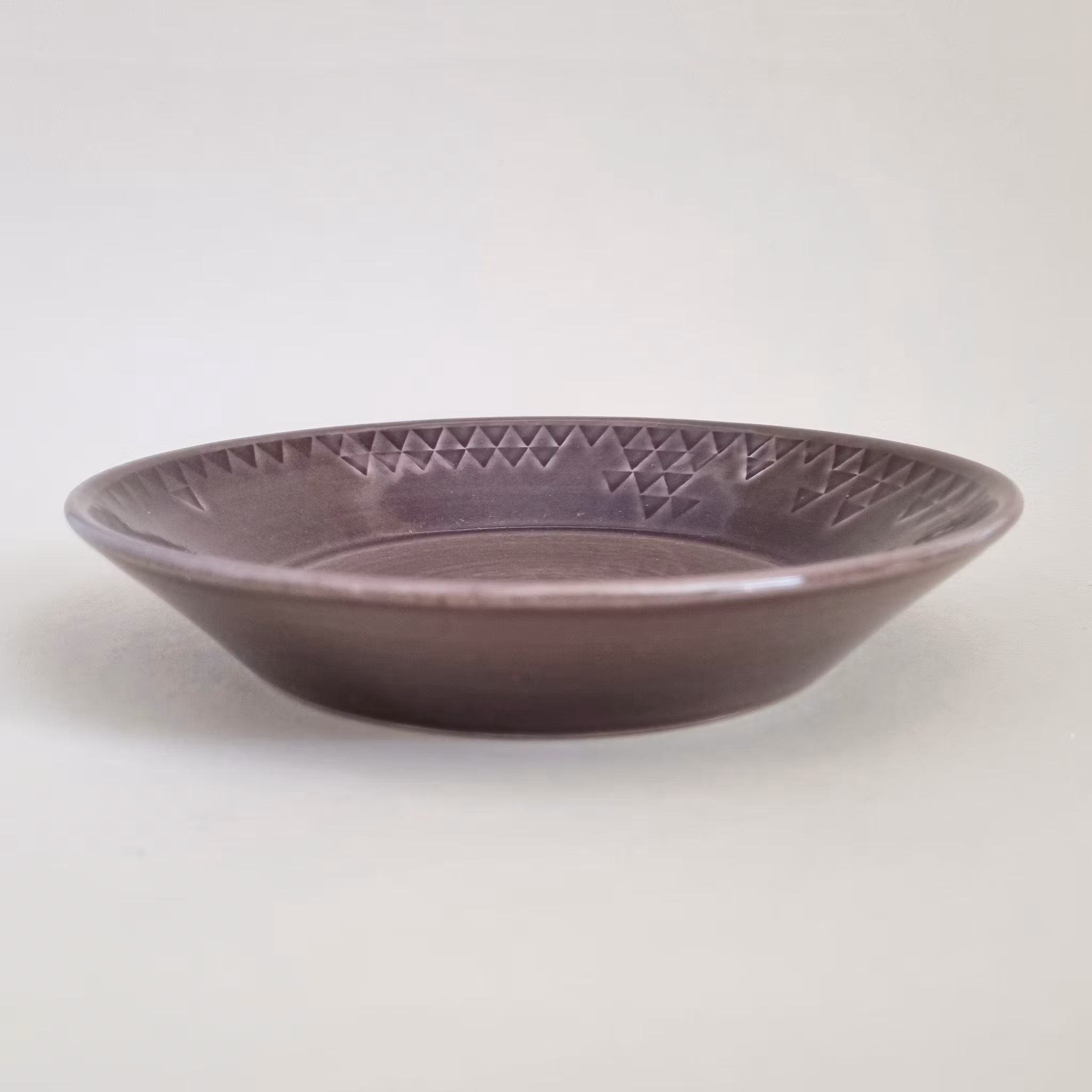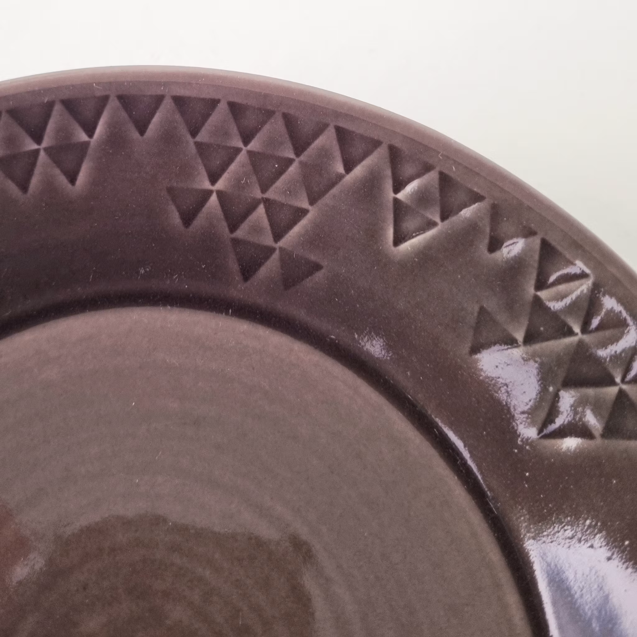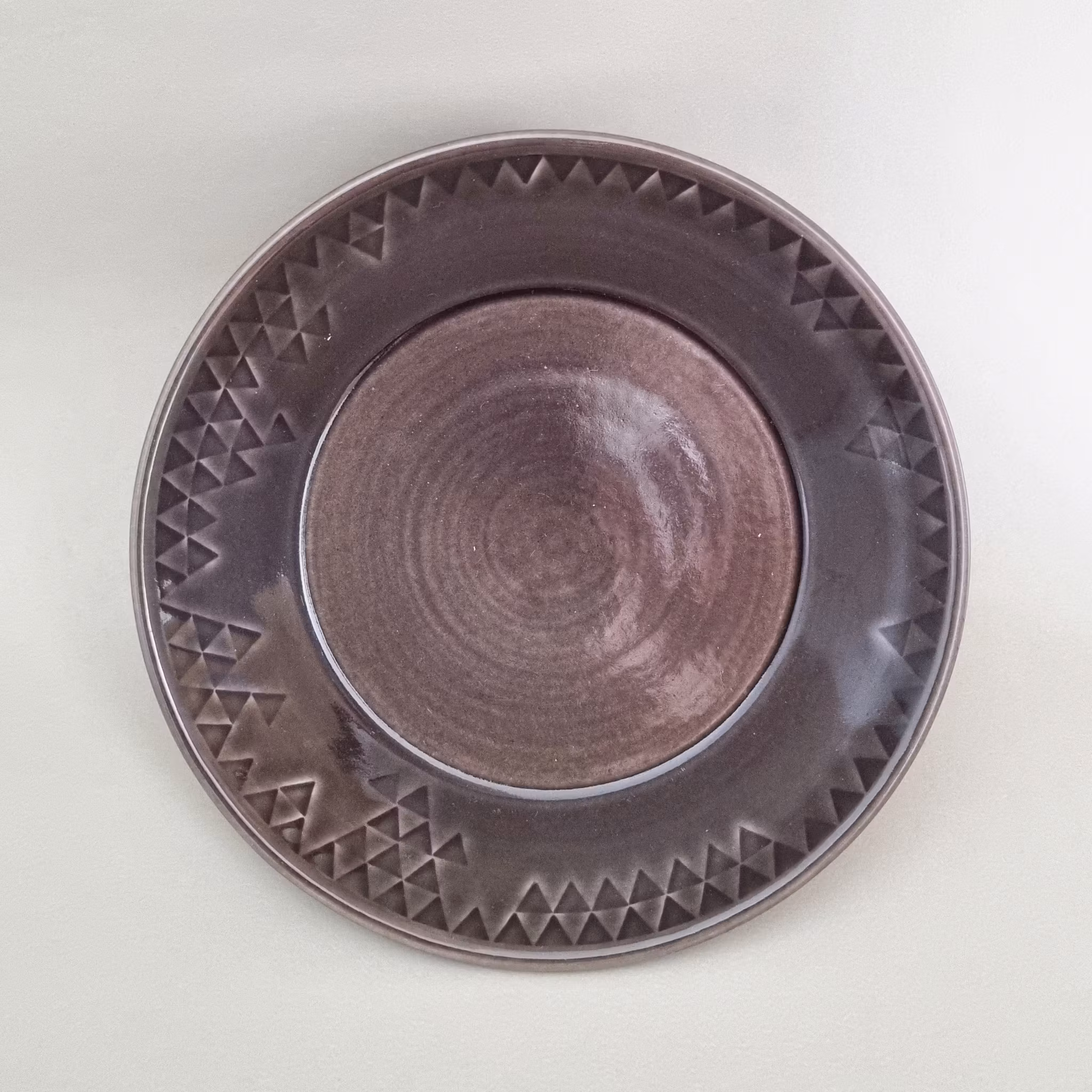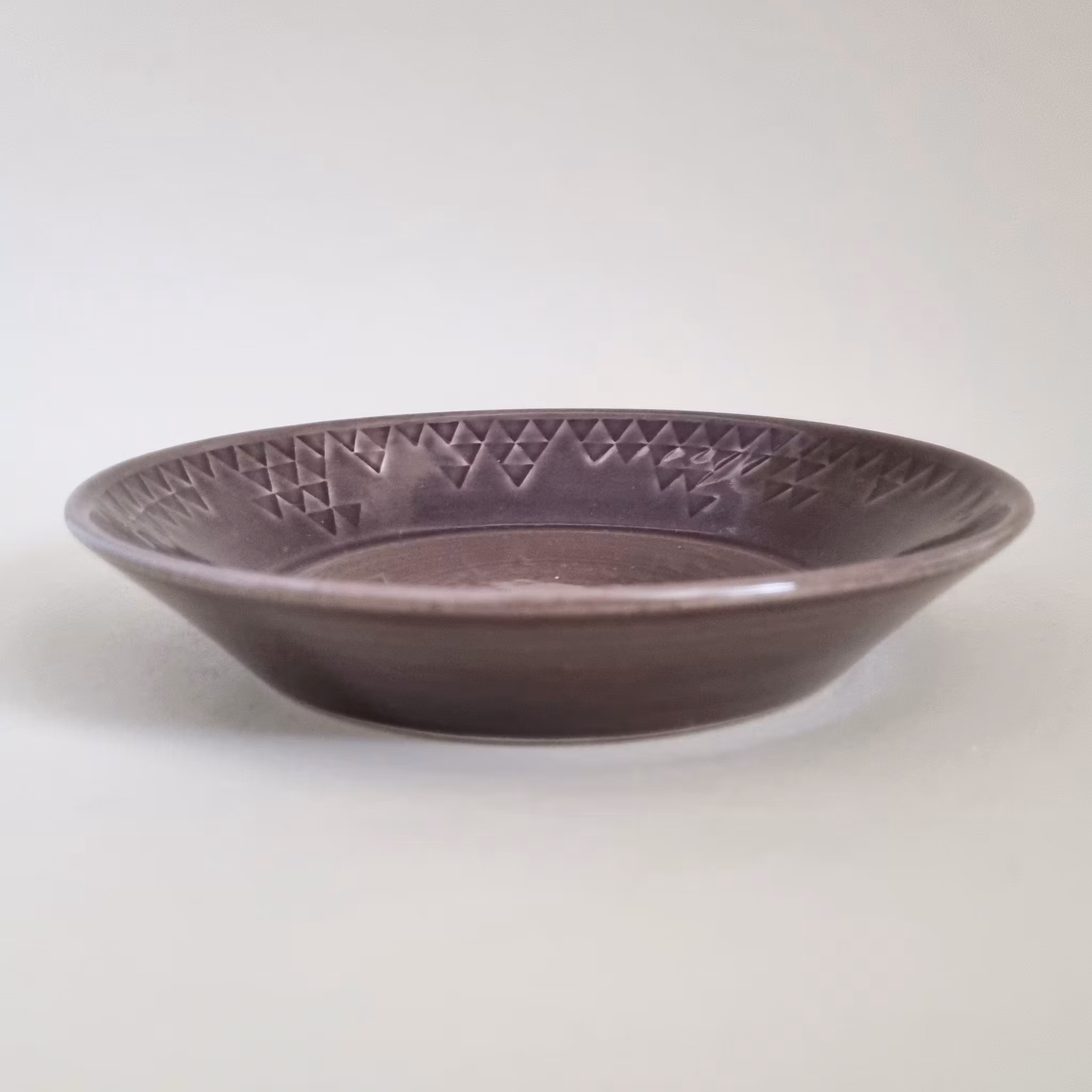Drejad skål med unik stämpeldekor. Gjord i stengodslera med brun glasyr. Diameter ca 18 cm, höjd ca 3,5 cm.