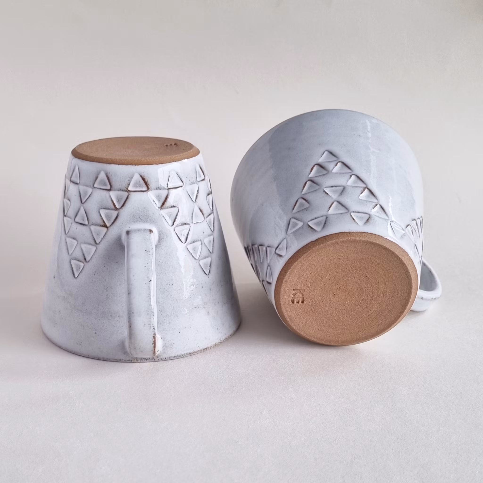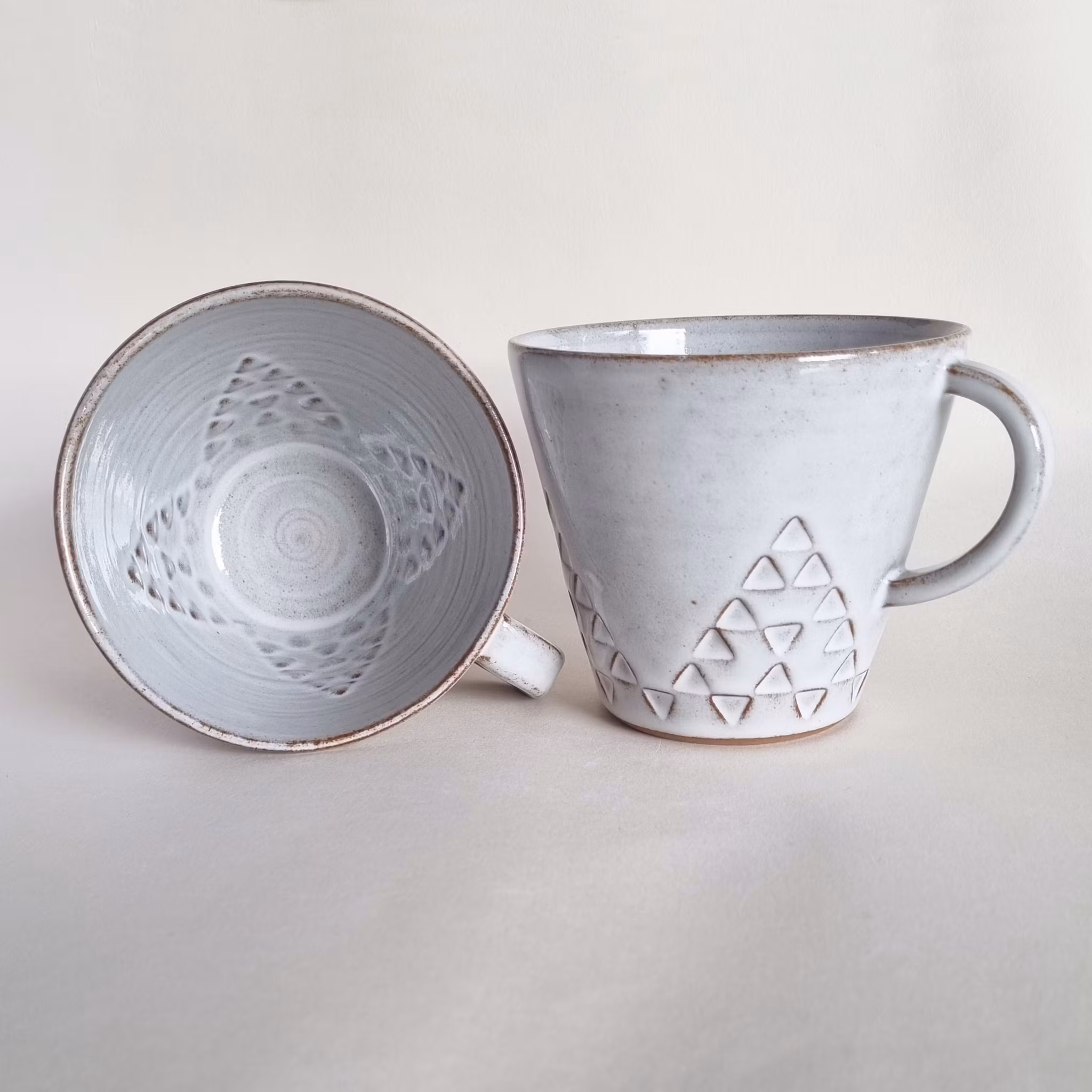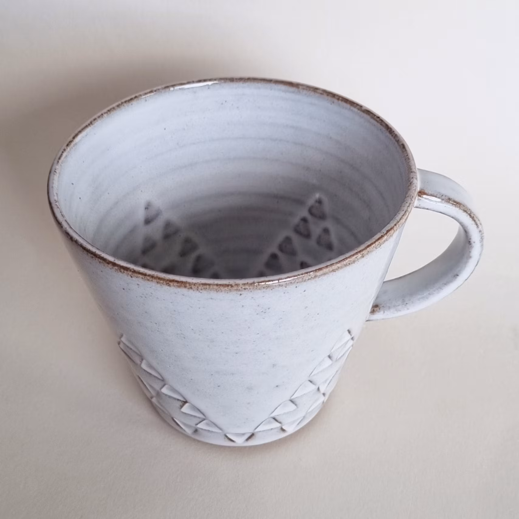 Tekopp drejad i mörk stengodslera med stämpeldekor och en vit glasyr. Höjd 9,5 cm, diameter 11 cm, rymmer ungefär 3,5 dl.