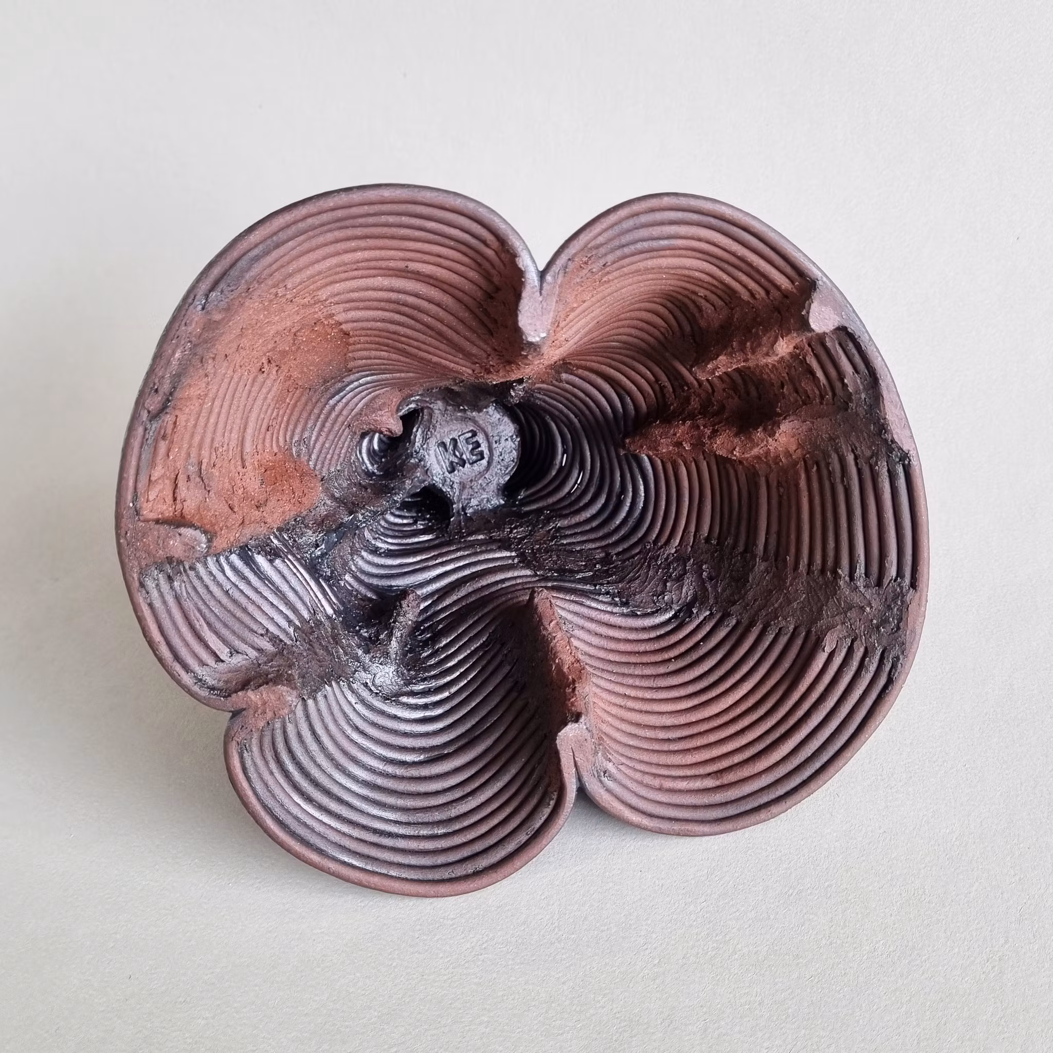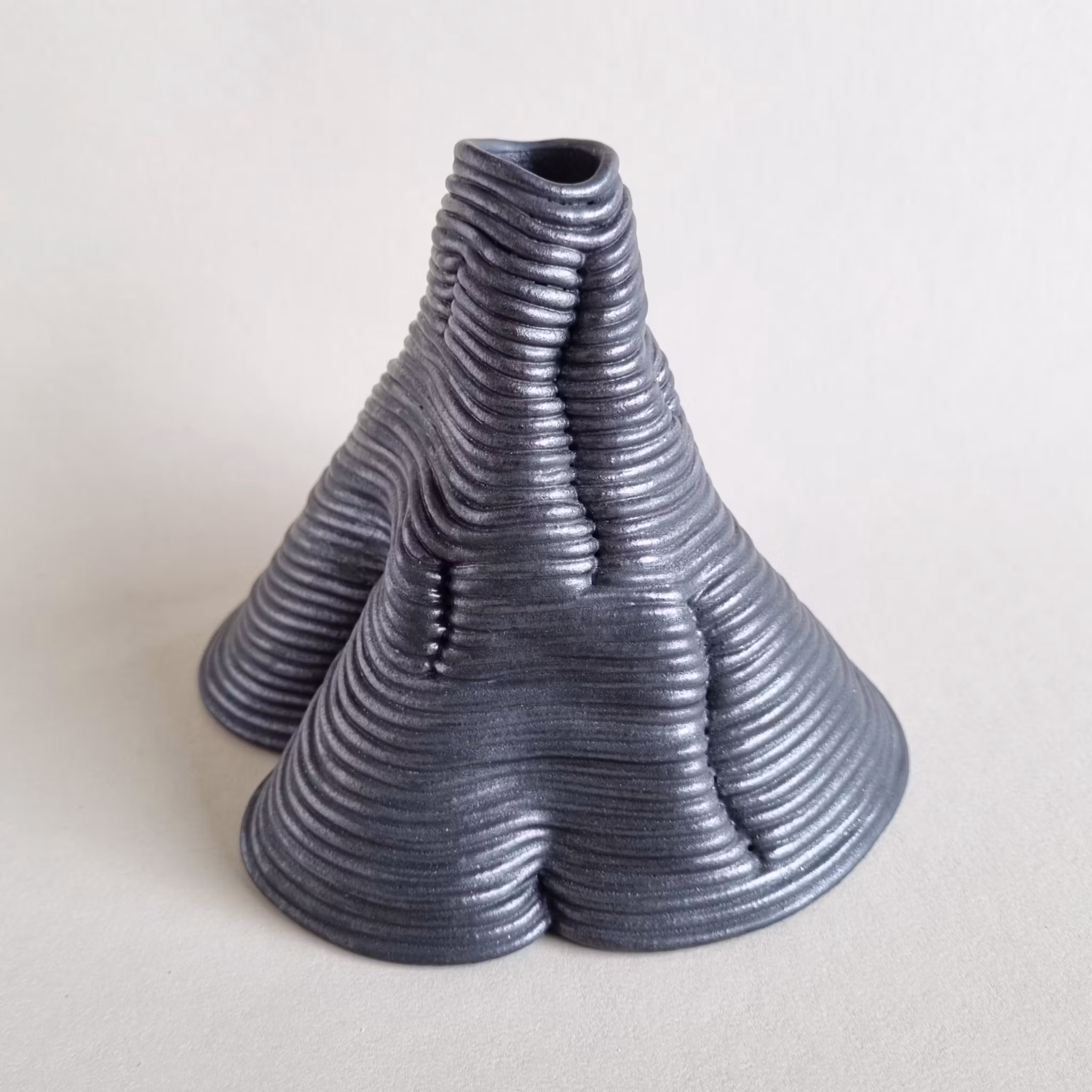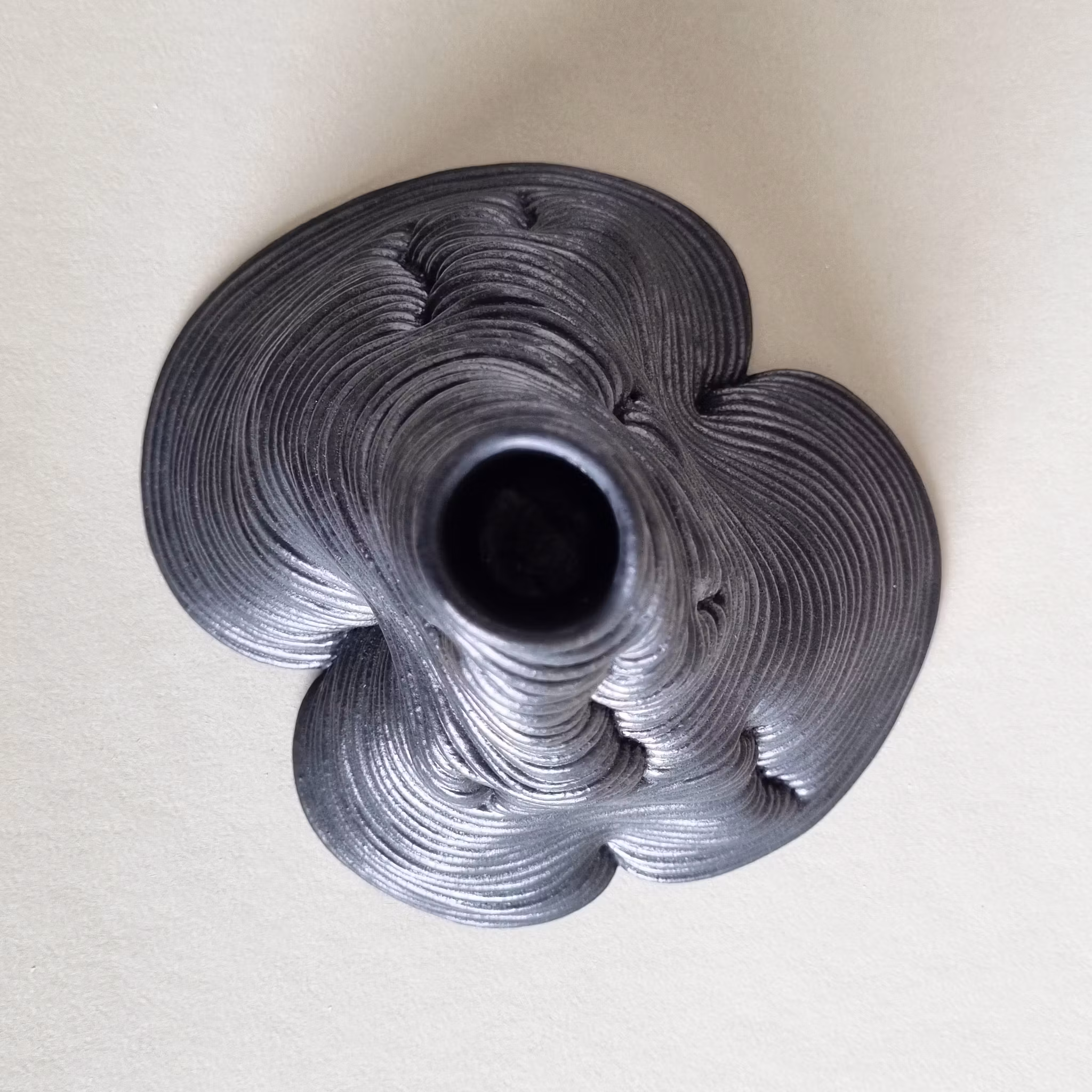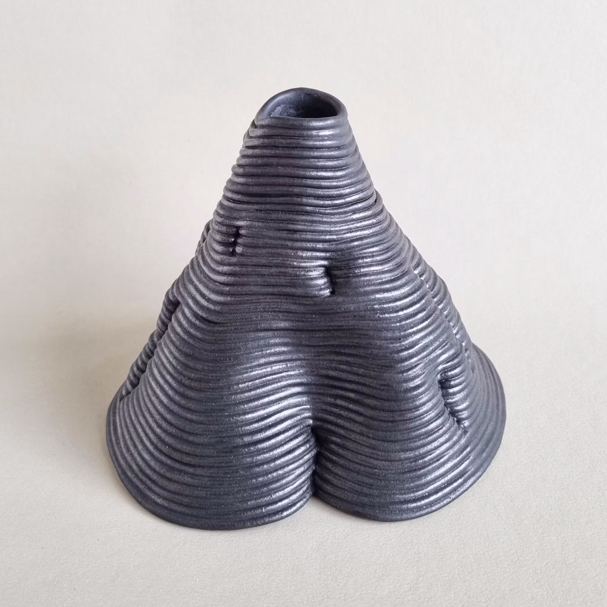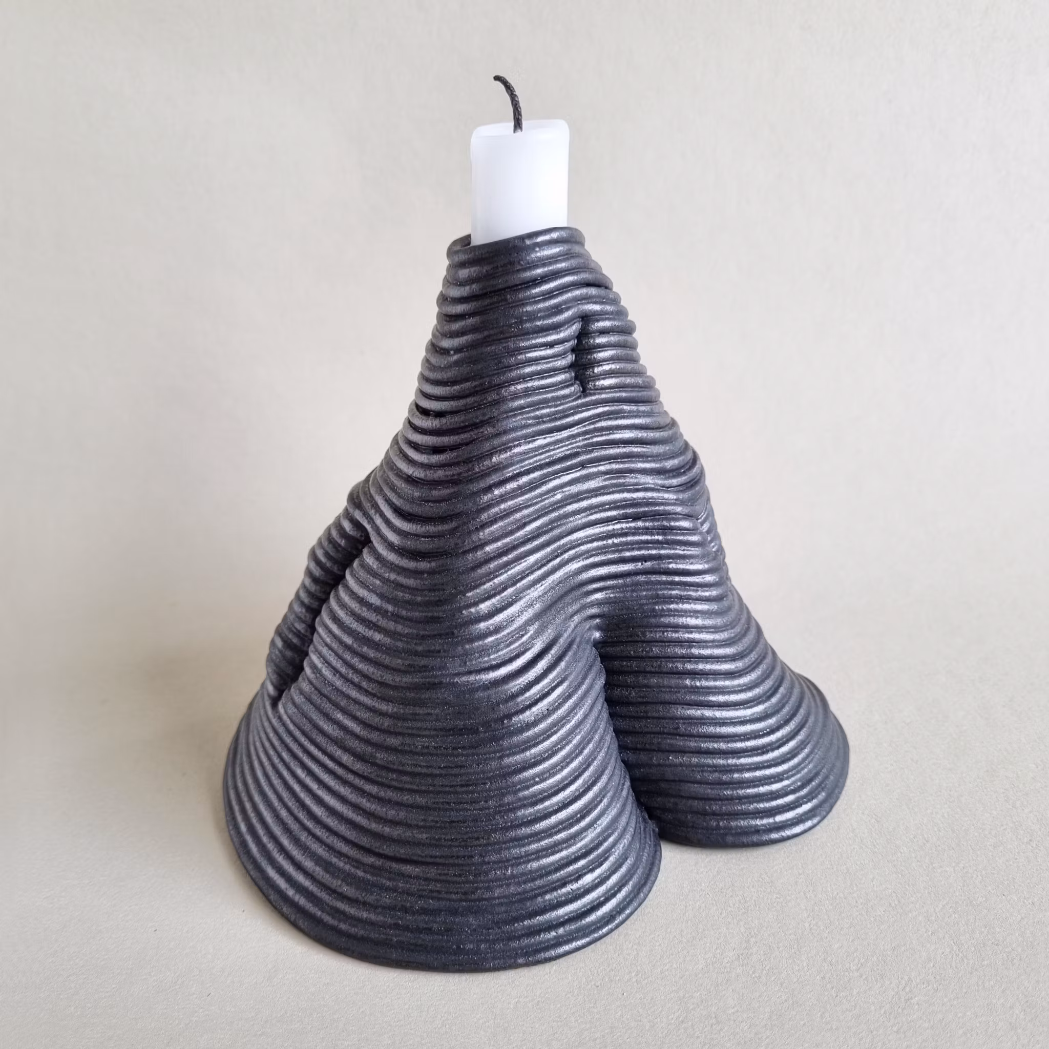 Skulptur och ljusstake. Diameter 16 cm, höjd 13 cm. Handbyggd i mörk stengodslera med svart glasyr.
